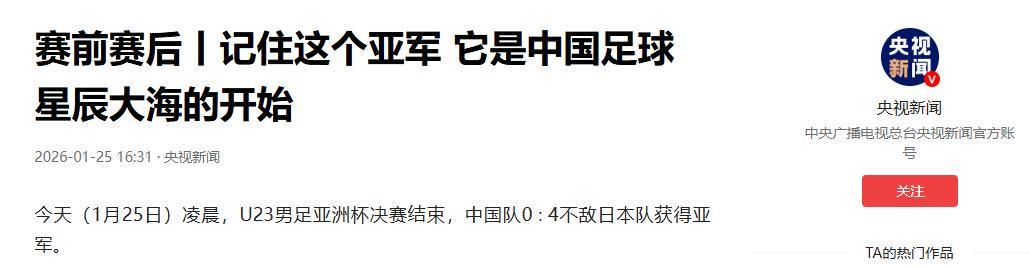央视新闻:2026年U23男足亚洲杯决赛 中国队收获亚军 创赛事历史最佳战绩